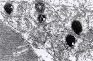 3. stage III premelanosome (partially obscured longitudial filaments caused by melanin deposition)