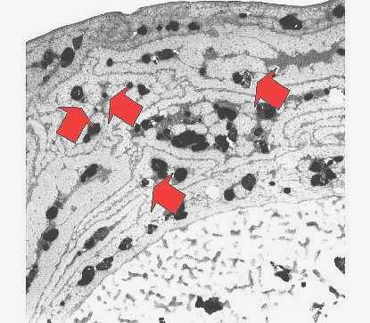 Detail of the cortex of a wingcovert feather barb of a bronze fallow showing eumelanosomes of poor quality (magn. 17.400x).