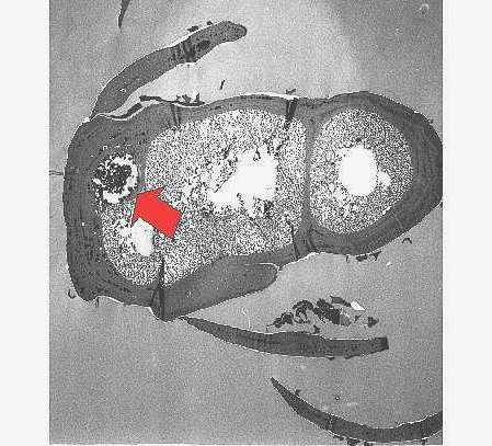 Cross section of a full grown wingcovert feather barb of a bronze fallow showing a cavity in the cortex filled with eumelanosomes of poor quality (magn. 2600x).