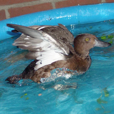 Op dat moment hadden we een opblaasbadje voor kleine kinderen van een paar euro gekocht om haar toch wat meer bewegingsvrijheid te geven. Ons kuiken was namelijk ook in het water erg actief. Ze dook veel en lang en draaide onder water vaak heel snelle rondjes. Dat kwam omdat het een duikeend was. Een Europese Kuifeend om precies te zijn. Duikeenden duiken meer en langer dan gewone wilde eenden (Dat zijn dan ook zwemeenden). Maar dat kwamen we pas te weten toen ze haar volledige verenkleed had. In het badje en erbuiten maakten we van bakstenen trapjes zodat ze er zelf in en uit kon en we haar zo min mogelijk hoefden op te pakken. Want we wisten nog niet wat we met haar moesten als ze volwassen zou zijn. Als ze losgelaten zou moeten worden in de vrije natuur was het beter als ze niet al te veel aan mensen en mensenhanden gewend zou zijn.